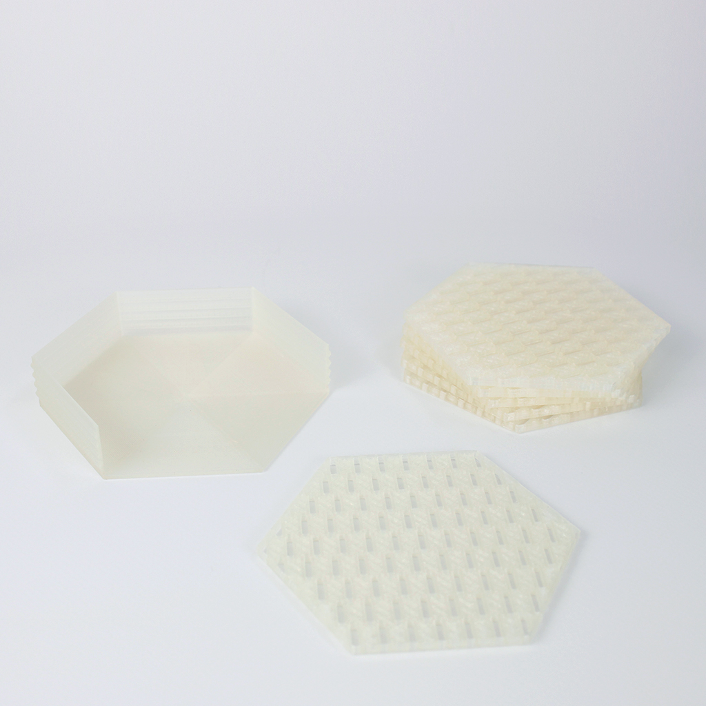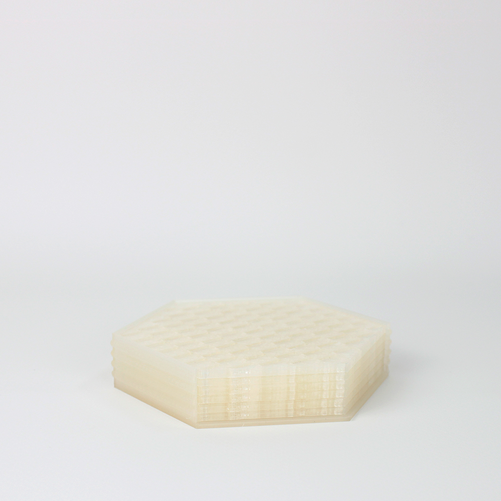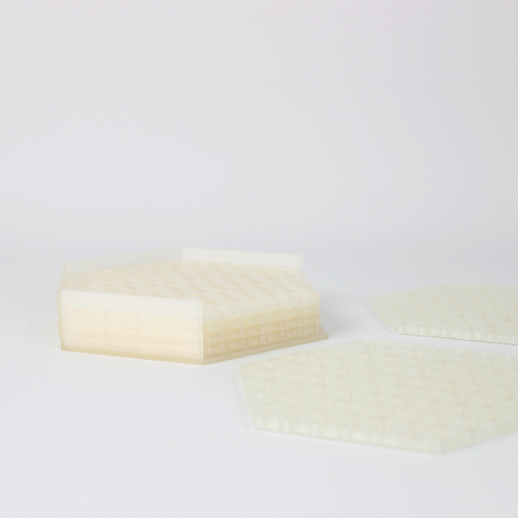 En ese edificio la luz, que penetra a través de los huecos magistralmente dispuestos, es el principal “material” arquitectónico. De la misma manera que esos huecos quedan representados en este posavasos, lo harán los haces de luz cuando coloquen sobre él cualquier vaso acristalado.