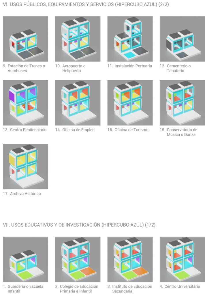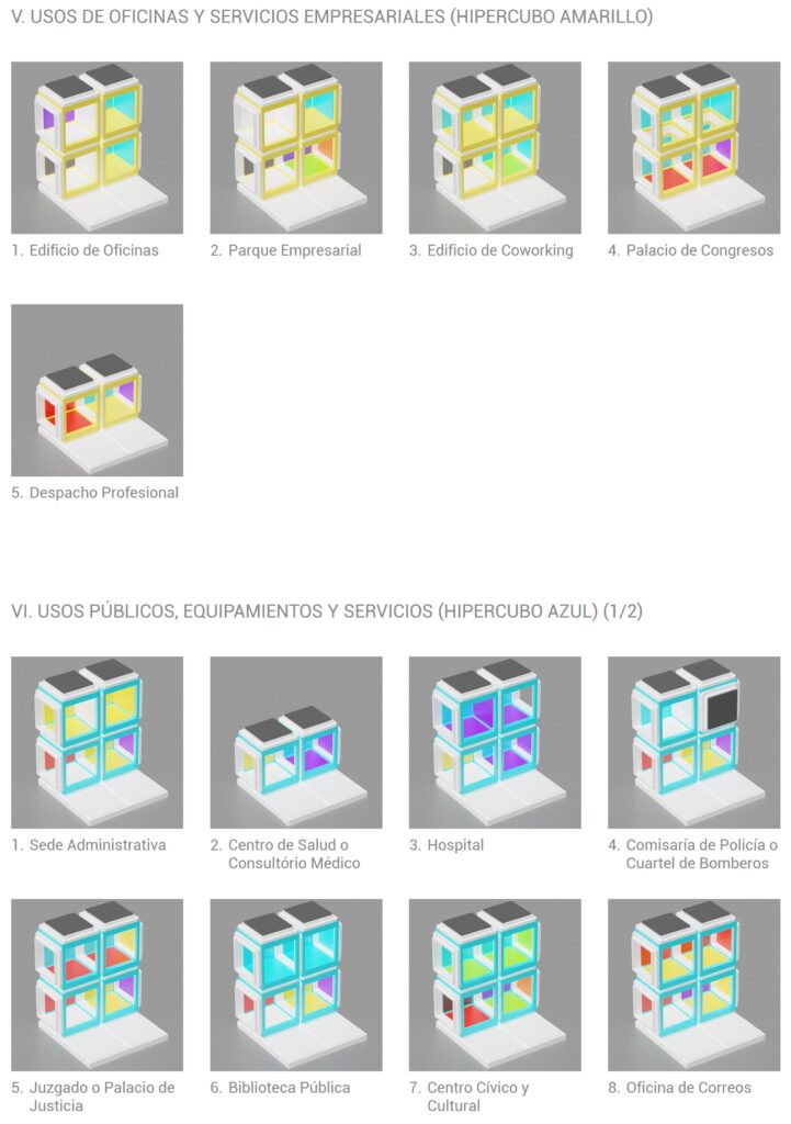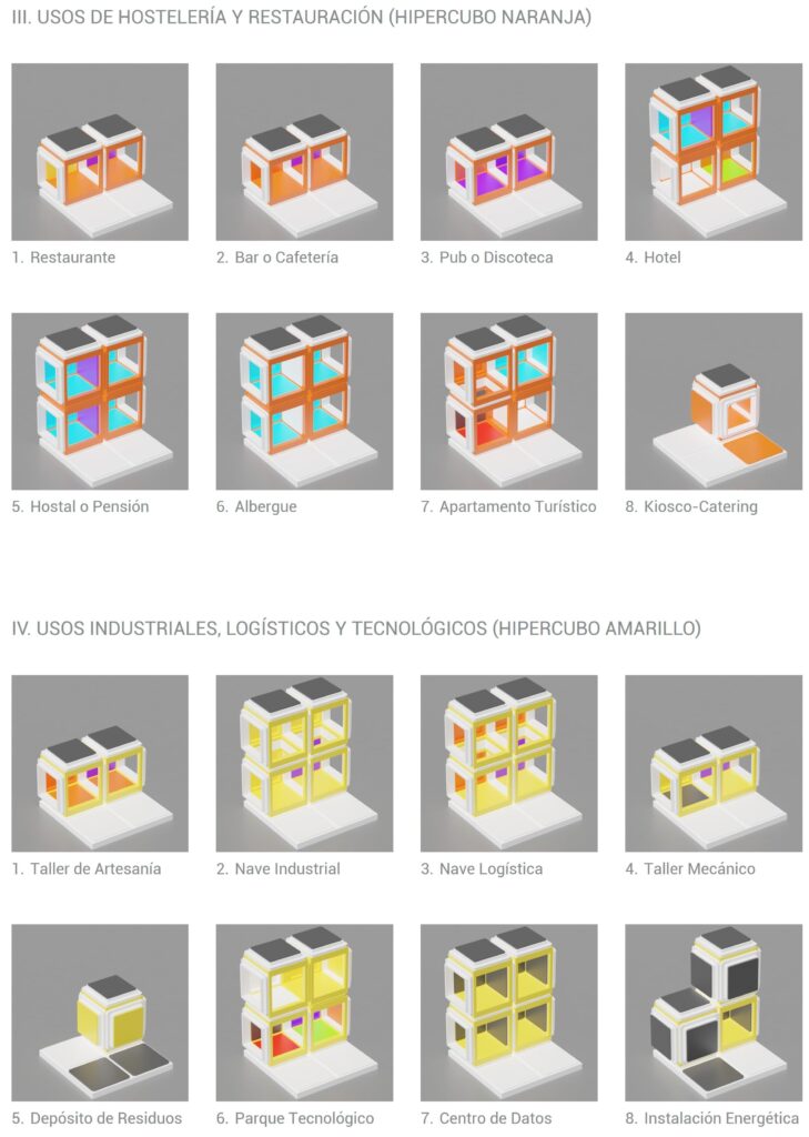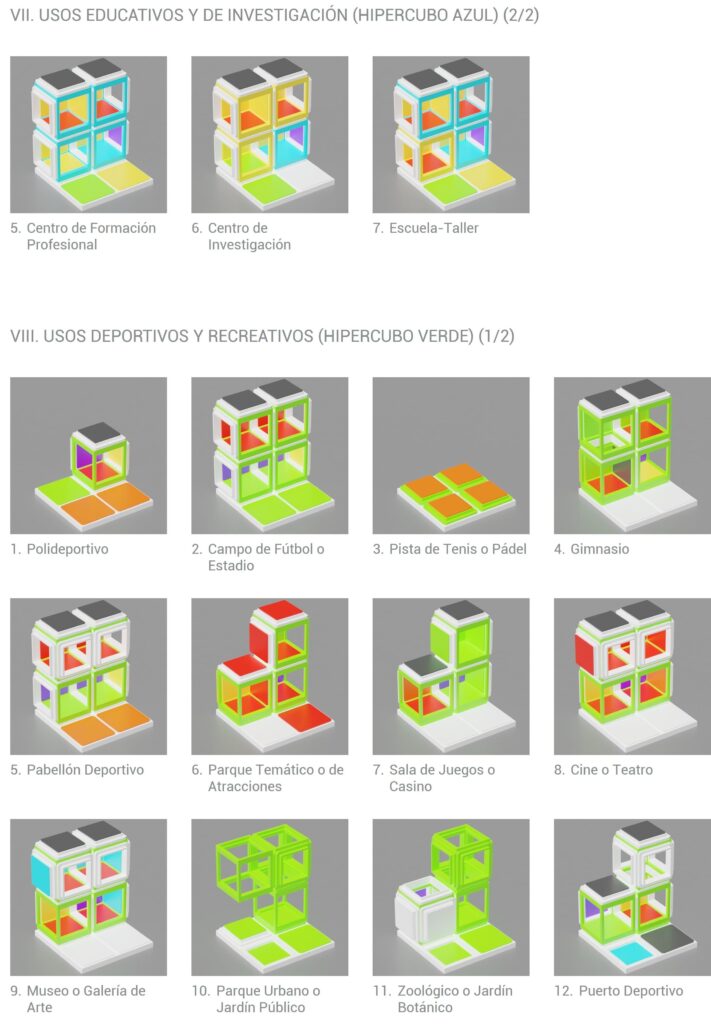 A continuación, mostramos algunas de esas asociaciones como secuencias lógicas de un catálogo de tipologías urbanas. En él observaremos también la jerarquía que se establece entre los distintos componentes, siendo la celda cúbica principal (main cubic cell) la que determina tanto el color como el uso genérico del hipercubo correspondiente.