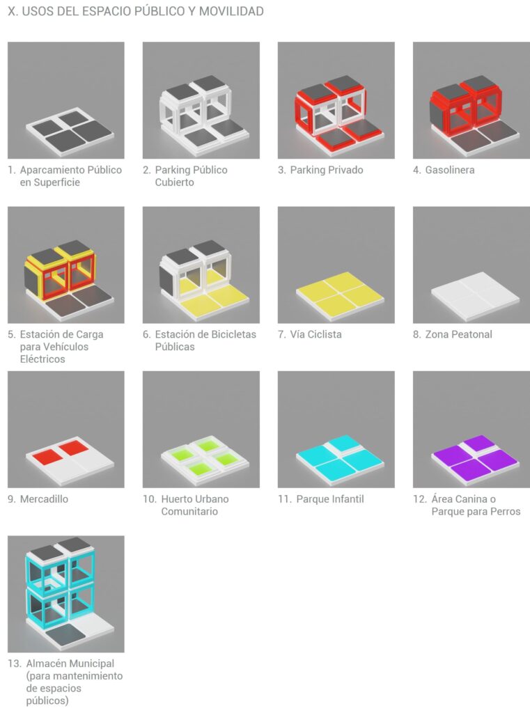 En la combinación de estos elementos y colores (con sus respectivos significados) surge todo un lenguaje urbano que nos permite crear múltiples composiciones interactivas; esto es, expuestas a la interpretación y adaptación de cuantos participen en ellas (tal y como sucede en la música o en la literatura). Y siendo esas piezas elementales los “átomos lógicos” de este lenguaje, es posible establecer todo un compendio de posibles asociaciones (o “moléculas urbanas”, si seguimos la terminología que empleó Leoz en sus investigaciones en torno a la estandarización en la arquitectura).